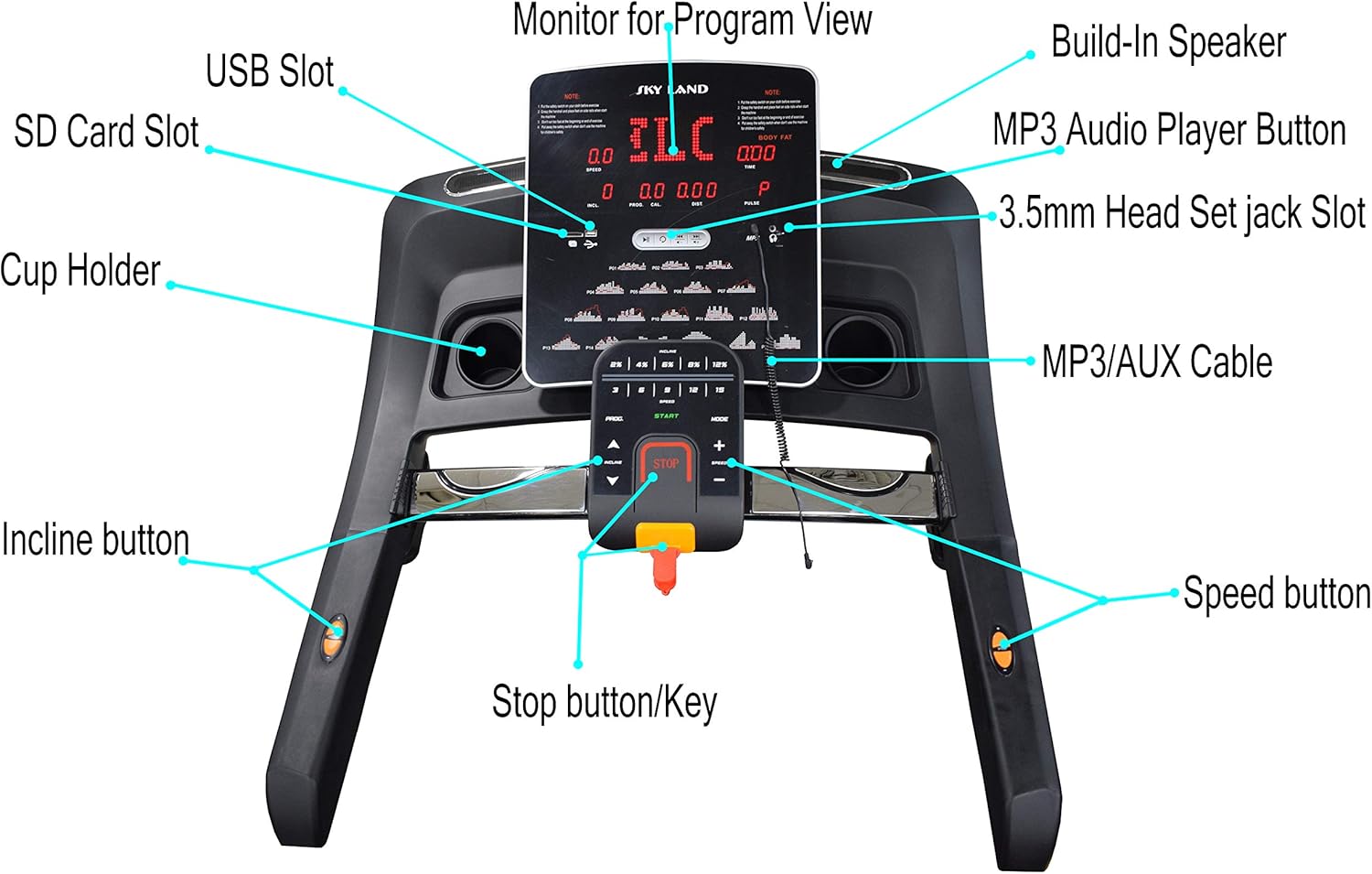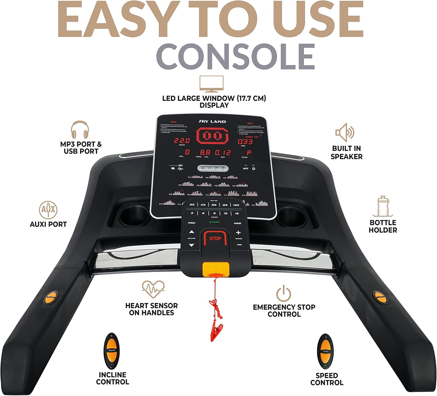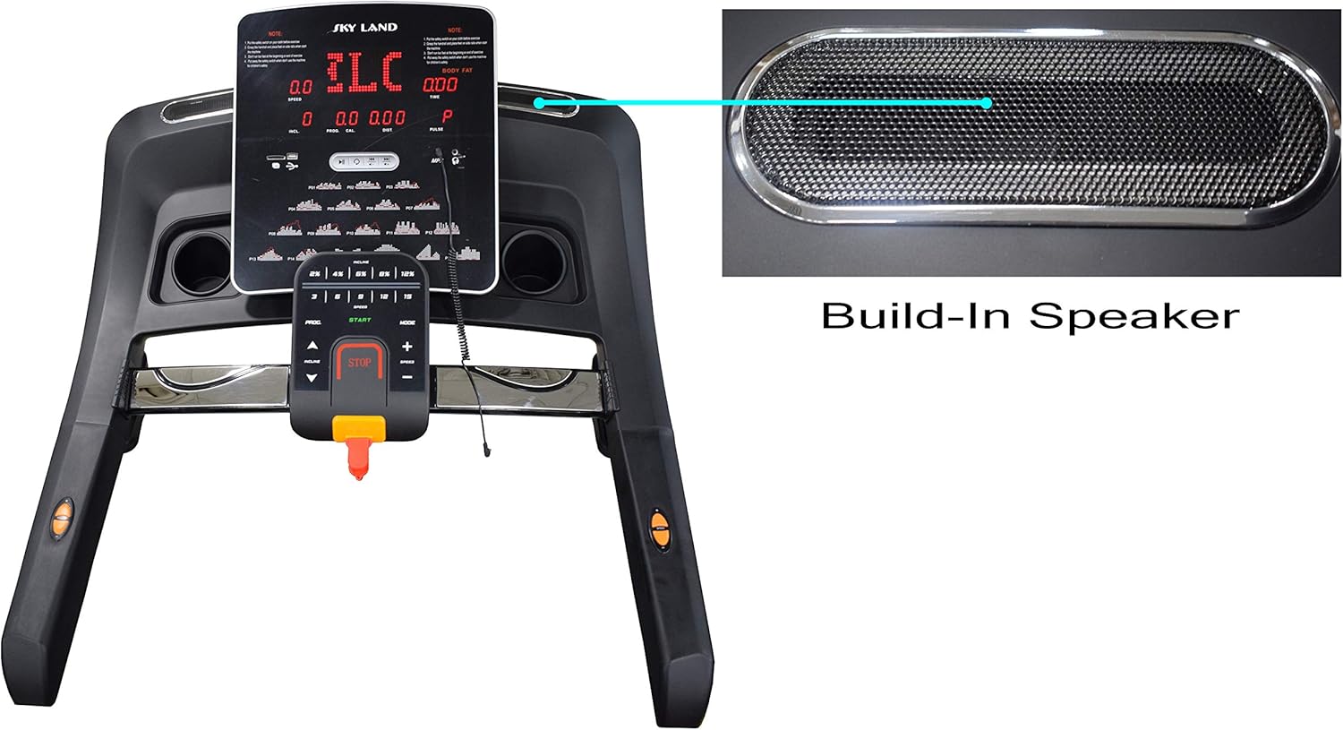 SPECIAL FEATURES: [Wide LED Display ] – Time, Speed, Distance, Calories, Pulse Rate, BMI | [No. of Preset programs: ] 18 | [Target Mode: ] Set & Chase Targets in Speed, Distance, Calories, Time | [ Hand-Rail Controls: ] Speed and Incline | [Music:] Bluetooth Speakers And FS App?C Aux Cable provided in package | Connect Phones & iPods to listen music during Workout & 2 Bottle holder