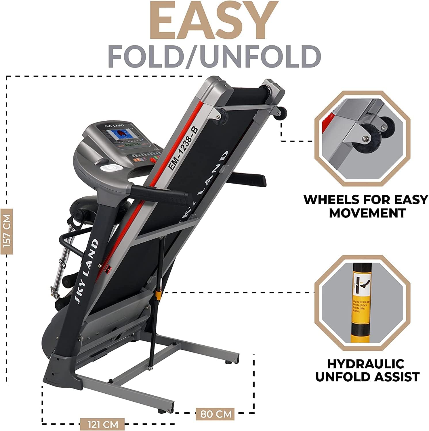 USER FRIENDLY DESIGN: The Skyland EM-1238 features accelerator keys, toolbar buttons with intuitive icons, and a built-in massager for added relaxation. Its easy-fold mechanism, assisted by two shocks, ensures convenient storage, and the unfolding running board lowers slowly for safety every time.