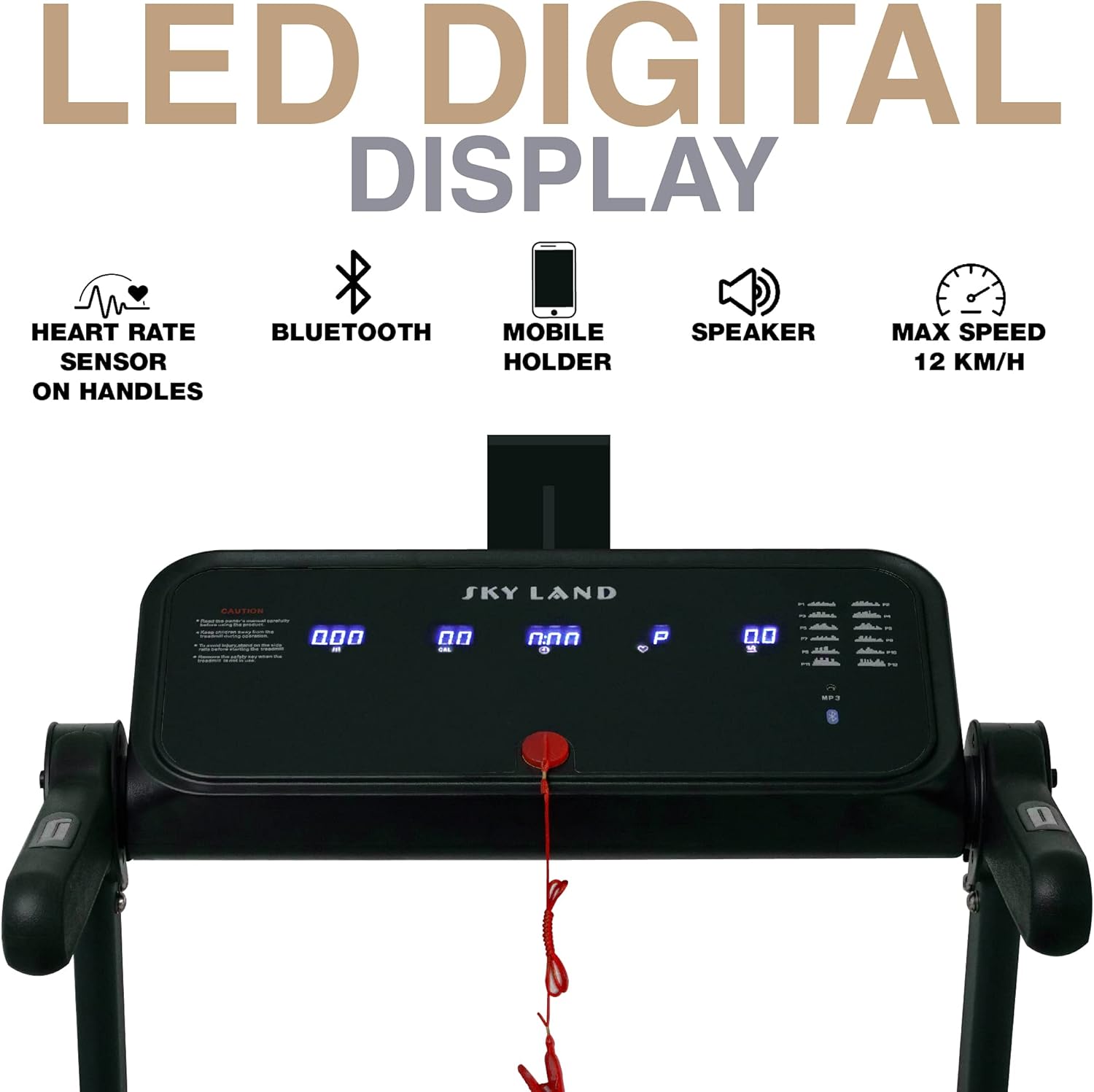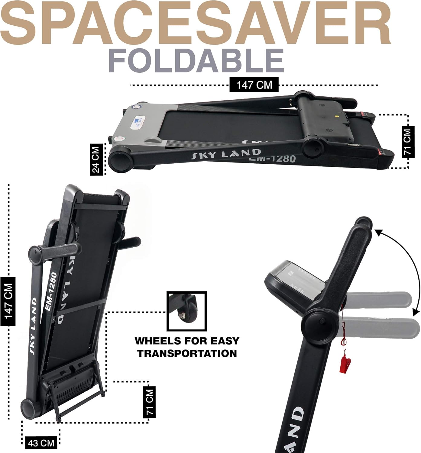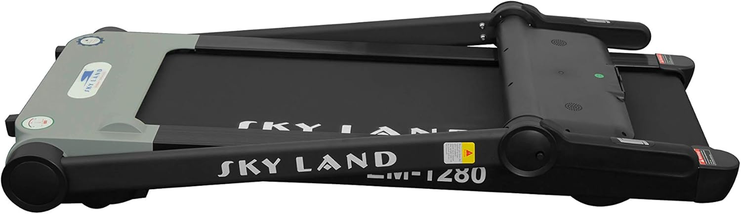 The SKY LAND EM-1280 features a 2.0 HP continuous motor (4 HP peak) with speeds from 1?C12 km/h, delivering smooth and silent performance for walking, jogging, or running at home.