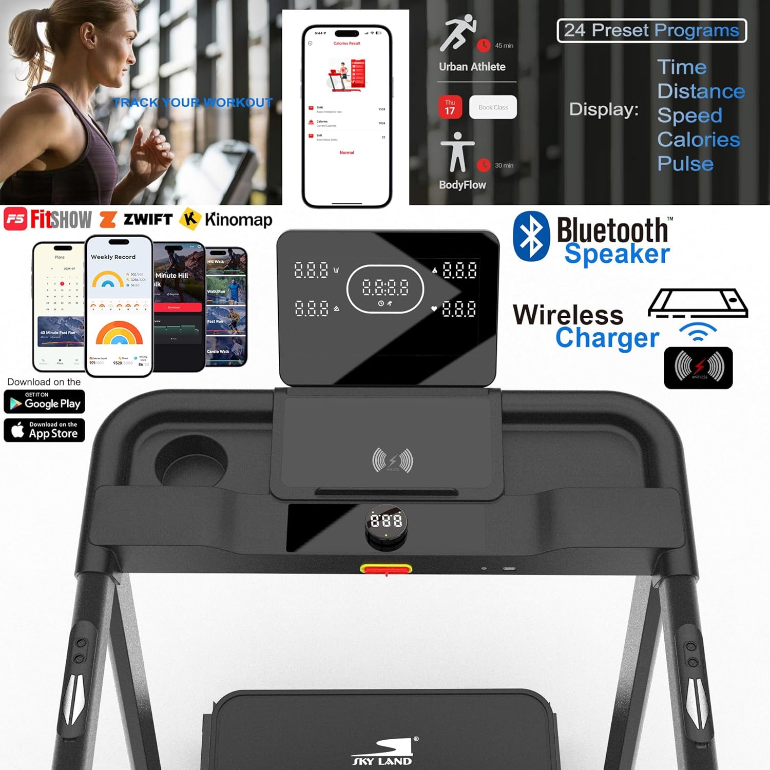 BLUETOOTH & MULTI-APP SUPPORT: Connect your treadmill to popular fitness apps like Fitshow, Kinomap, and Zwift via Bluetooth. Enjoy personalized workouts, track your progress, and stay motivated with real-time updates on speed, distance, calories, and more.