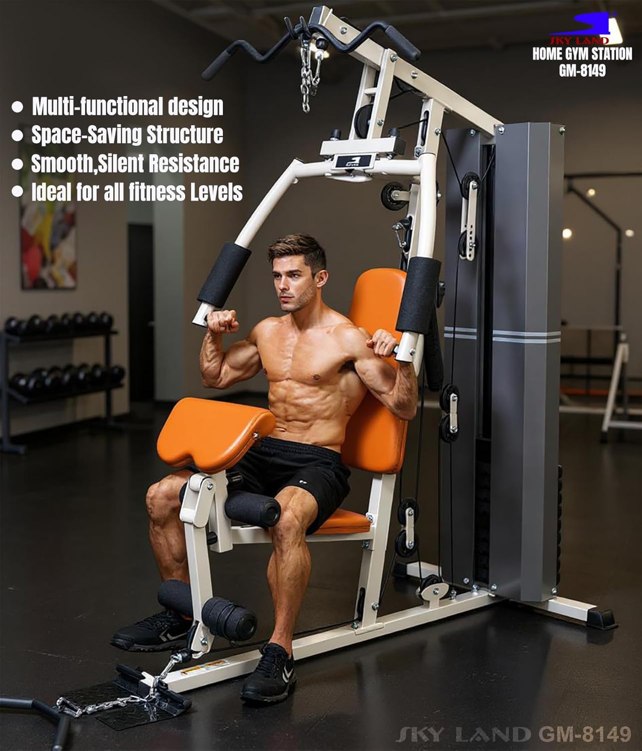 Maximize your fitness potential with the SKY LAND GM-8149, a high-performance single-station home gym designed for professional-grade strength training in a compact footprint. This all-in-one gym station is the perfect solution for users who want a comprehensive workout without the bulk of multiple machines, making it ideal for apartments and personal home gyms.
