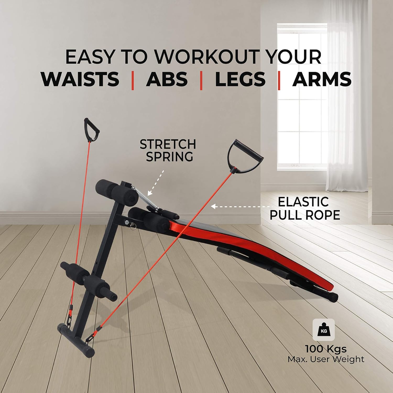 The SKY LAND EM-1856 Exercise Bench features a curved decline design for core and abs training. This 130kg capacity foldable bench includes 2×1.5kg dumbbells and resistance ropes, perfect for full-body home gym workouts.