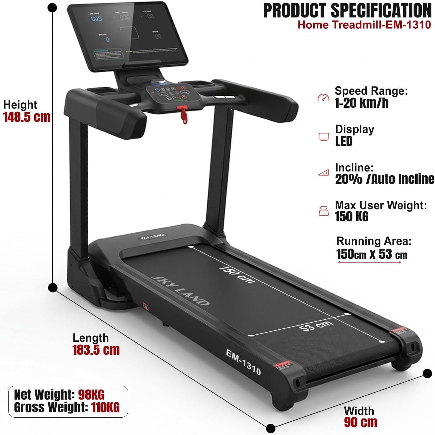 The SKY LAND EM-1310 is a heavy-duty home treadmill built for users who want reliable power, smooth performance, and modern workout support in one machine. Driven by a 3.5HP DC motor with 6.0HP peak output, it delivers a speed range of 1 to 20 km/h for walking, jogging, endurance runs, and interval training.