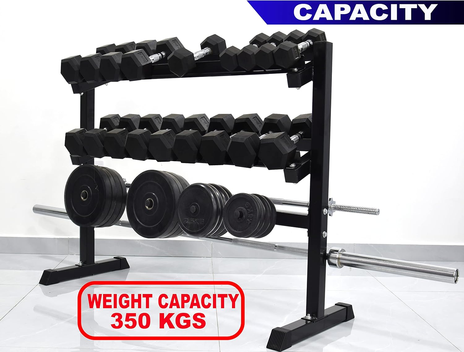 The versatile 3-tier design features dedicated space for hex dumbbells on the upper levels, while the lower sections are perfectly configured to organize weight plates and barbell bars. Its robust, reinforced base prevents wobbling, keeping your workout area safe and professional.