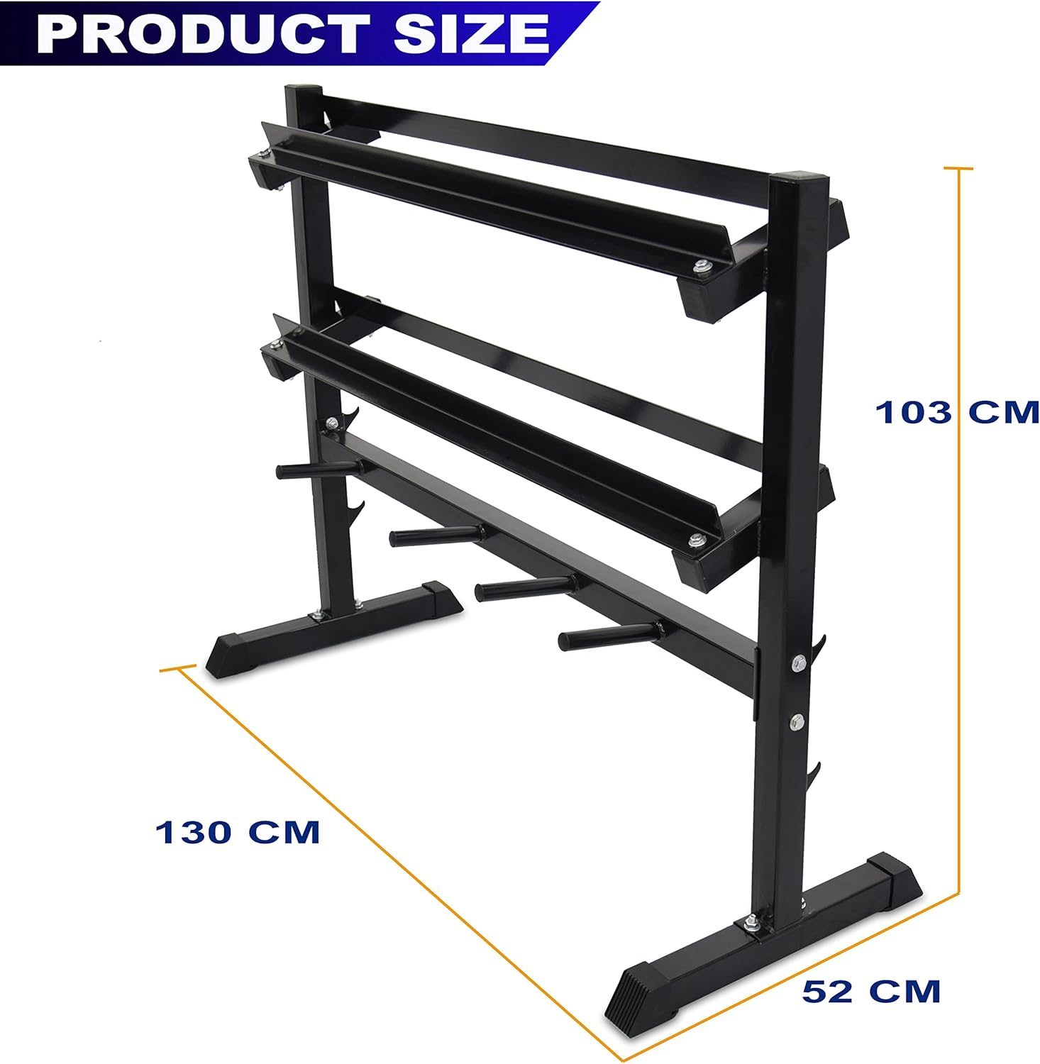 SKY LAND Fitness Weight Rack | Multiple Weights Storage Rack for Dumbbells, Barbells, and Weight Plates-EM-9226.This equipment stand exhibits a high-quality structure that combines functionality and practical design, creating a storage rack that can withstand daily, heavy use. This two-layer rack with four easy-access storage posts and a barbell holder offers multifunctional storage space for your dumbbell set, standard weight set, barbells, and other weightlifting tools. This EM-9226 has an oil-based finish that protects its overall structure from scratches, ensuring that its function, style, and tone will last for years. This weightlifting accessory storage rack also comes with four rubber end caps to protect your floor from any possible damage, scratches, or cuts.