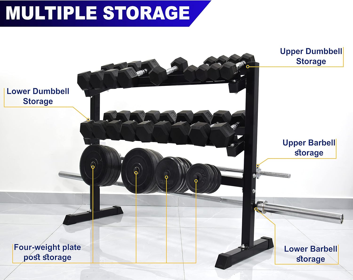 A: This is a versatile 3-in-1 storage solution. It features a two-layer top rack specifically for dumbbells, four side storage posts for weight plates, and a dedicated vertical holder for barbells, making it a complete hub for your weightlifting tools.