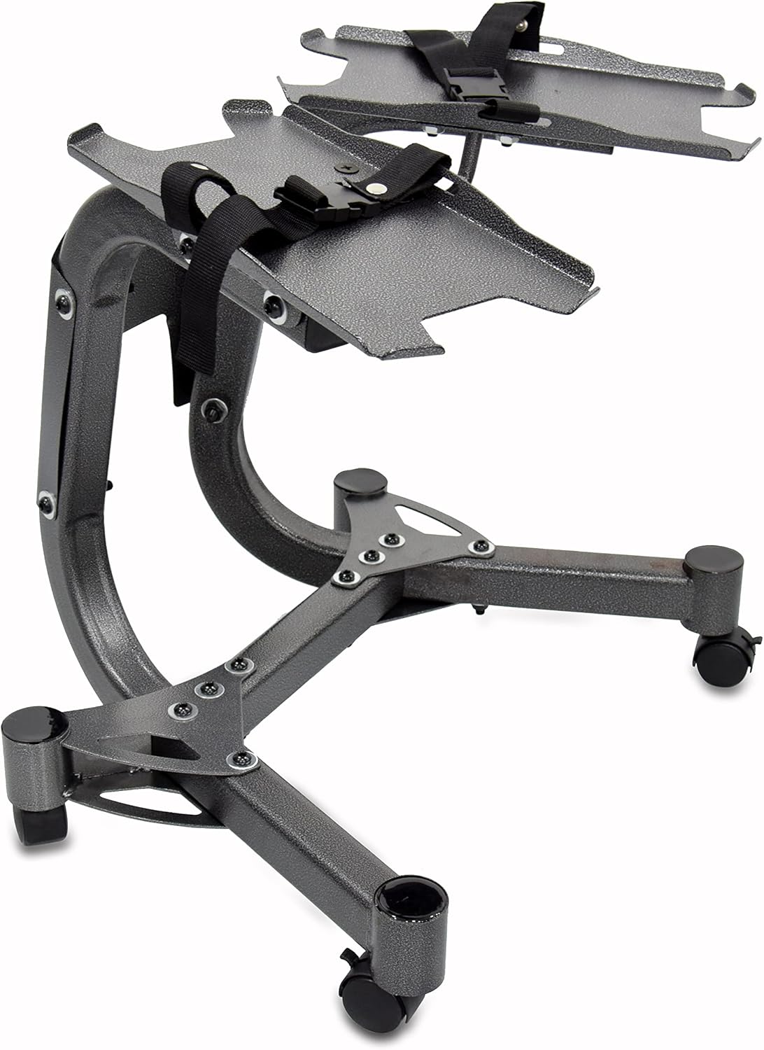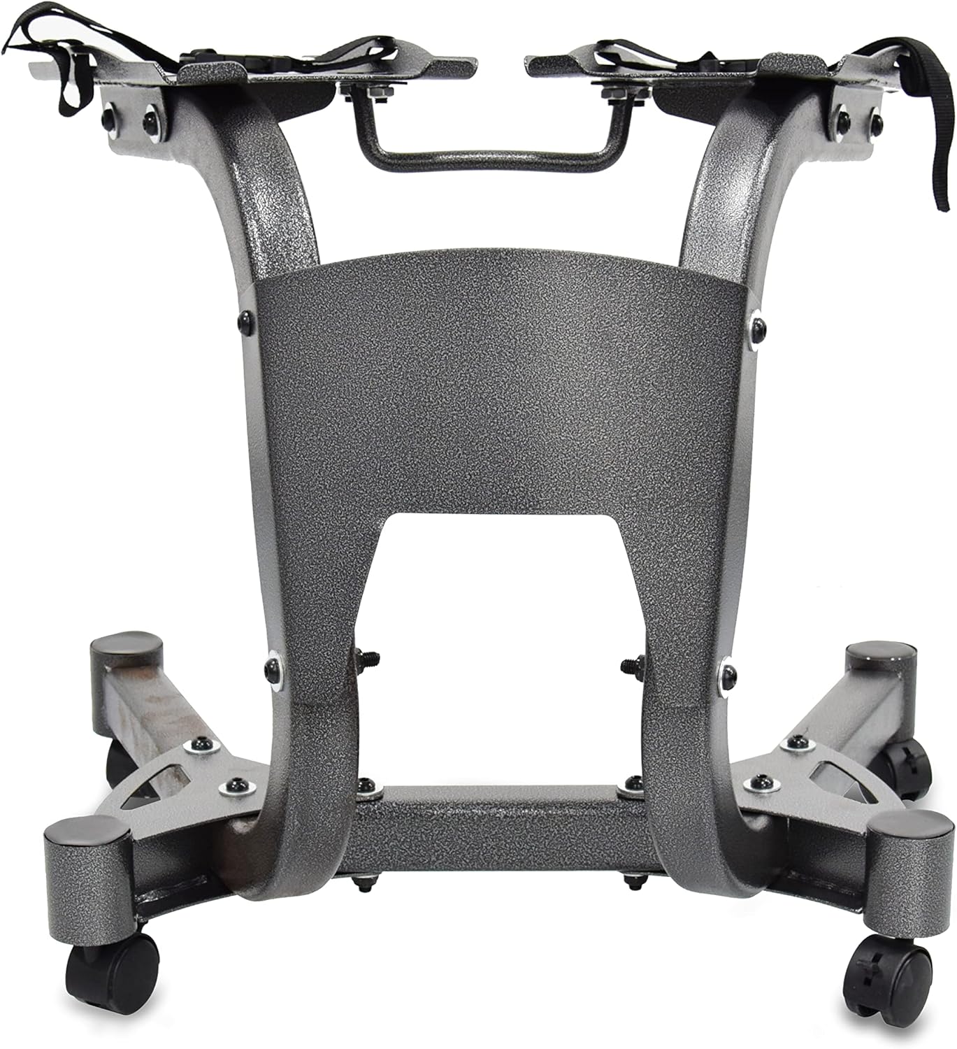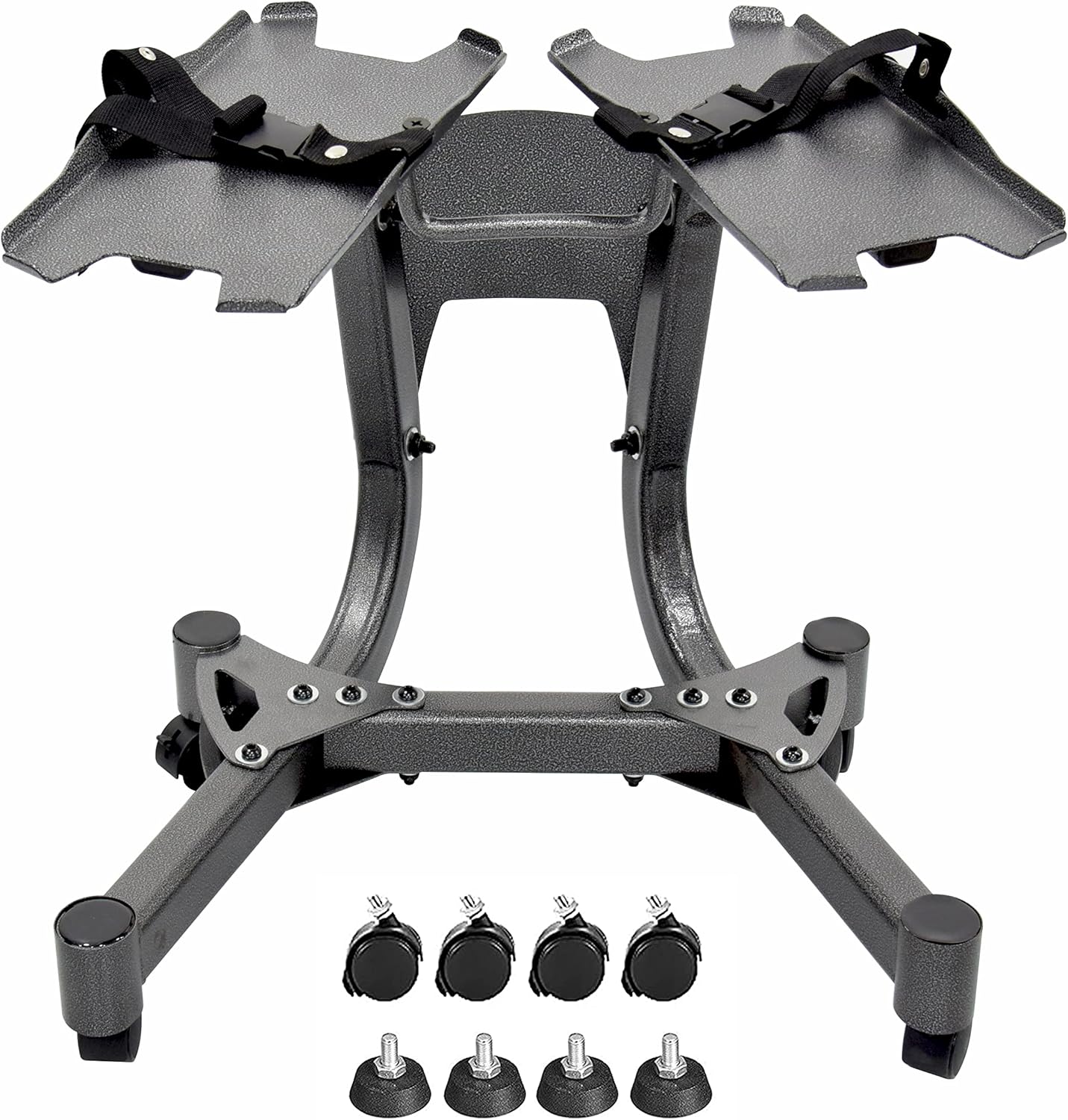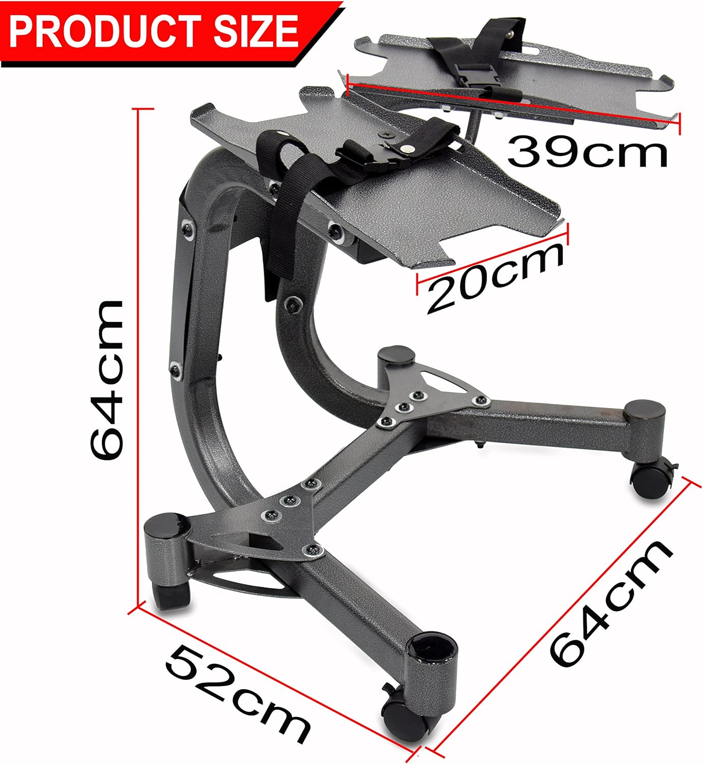 Equipped with heavy-duty locking casters, this stand offers easy mobility and a stable, anti-slip foundation once locked. The large 39 cm x 20 cm cradles accommodate most adjustable dumbbell brands securely. Built from high-quality stainless steel, it includes safety straps for extra protection.