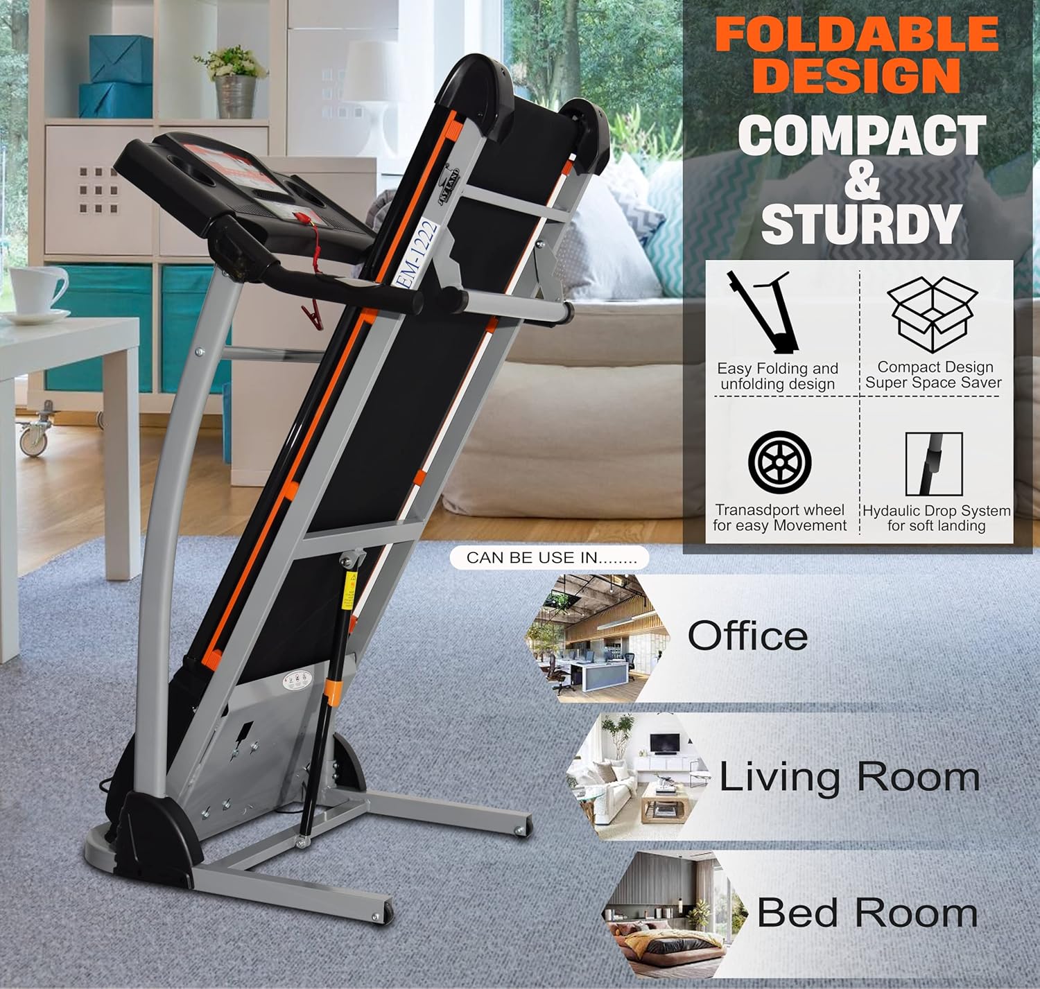 FOLDABLE TREADMILL FOR HOME SPACE SAVING Designed for modern homes and apartments, this foldable treadmill features a hydraulic soft-drop system and transport wheels for easy folding, storage, and movement after workouts.